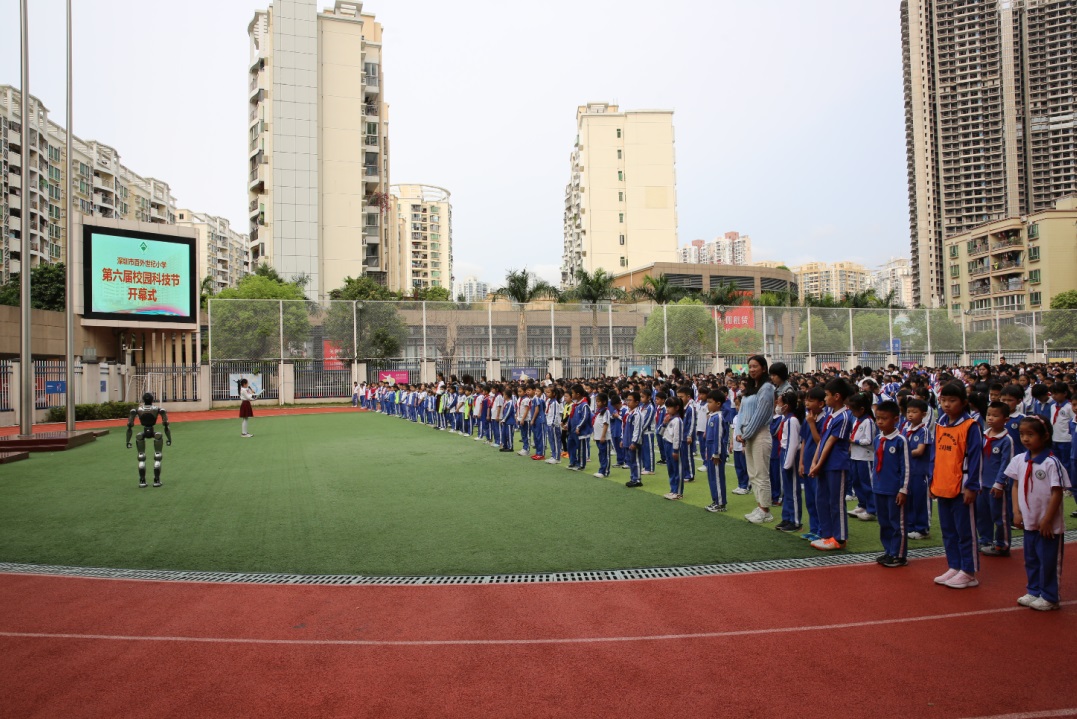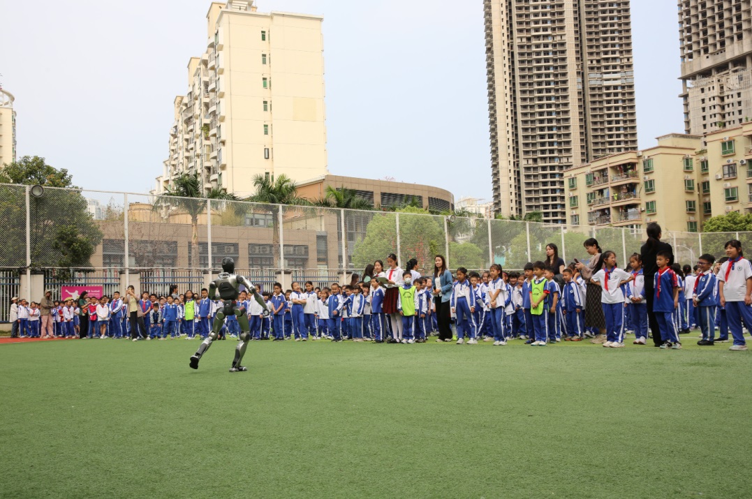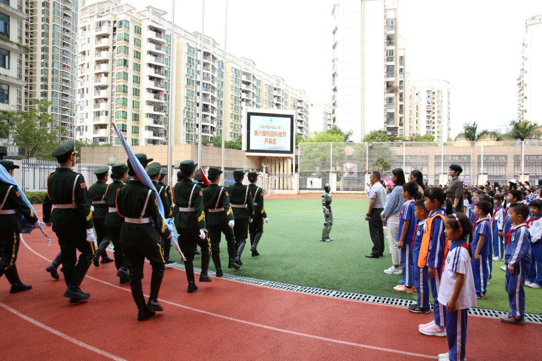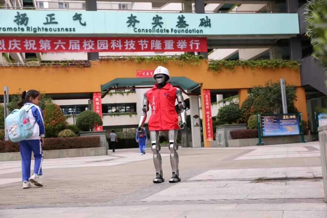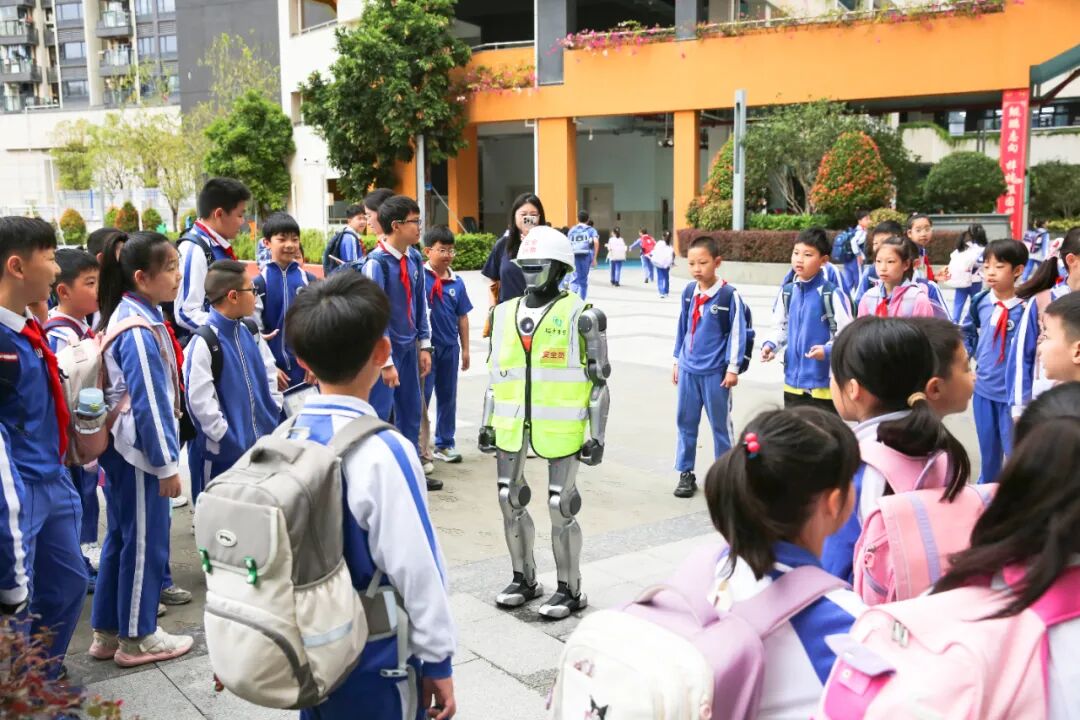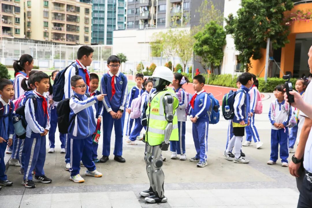 深圳市百外世纪小学第六届科技节迎来“硬核嘉宾”——由榕亨集团牵头与众擎、哈工大(深圳)联合研发的交通指挥机器人,亮相校园便引爆全场!
